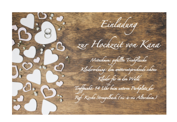 Dieses Mal ist das Thema „die Hochzeit in Kana“. Dazu laden wir die Kinder zu einem tollen Fest im Wald ein, welches wir gemeinsam vorbereiten und mit allen Gruppen durchführen.