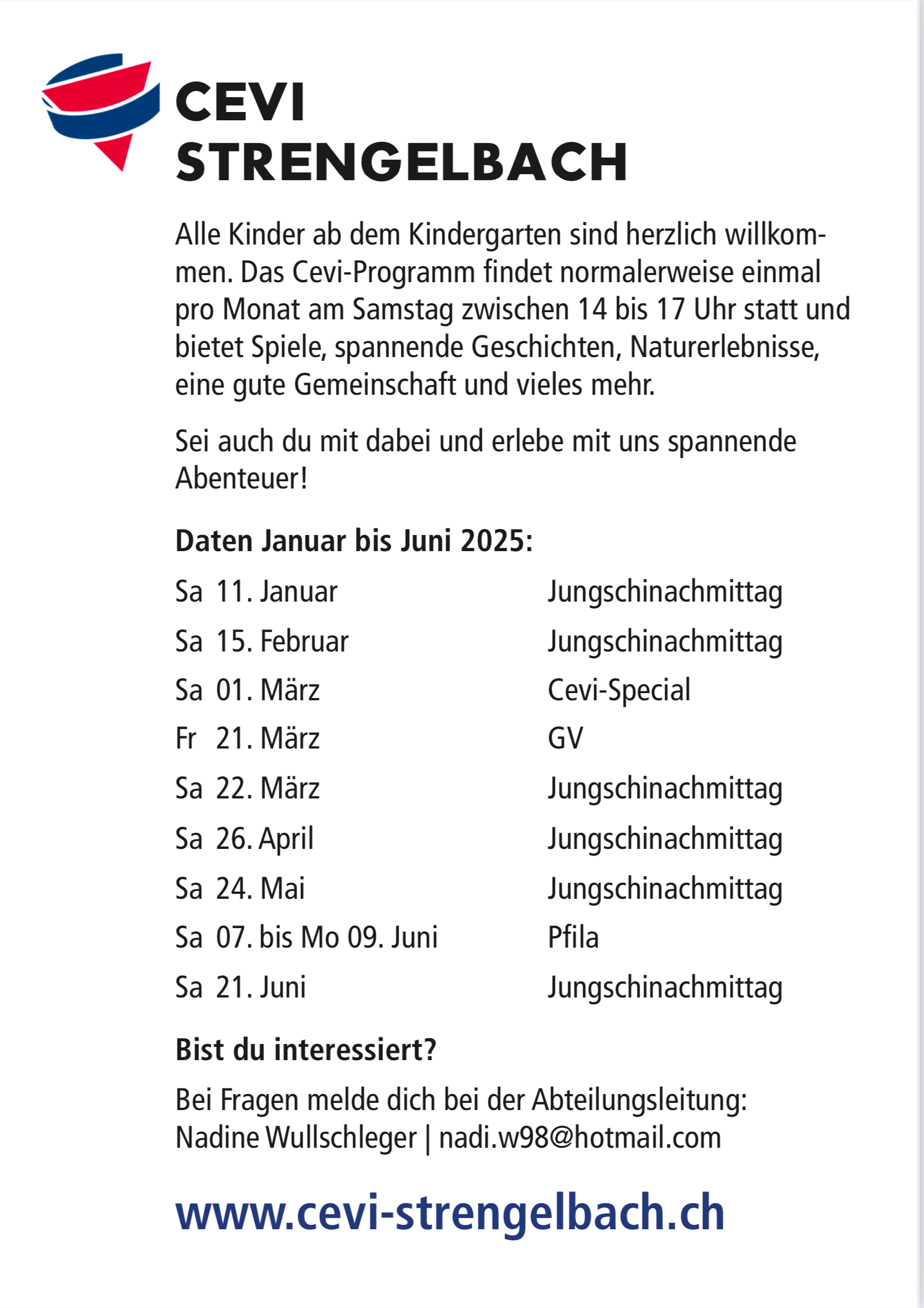 Wir freuen uns schon auf den nächsten Cevi Nachmittag. Ein tolles Programm wartet auf euch.